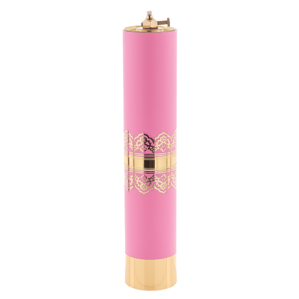 Świeca liturgiczna w kolorze różowym z bardzo trwałego tworzywa z wkładem olejowym o pojemności 180ml.