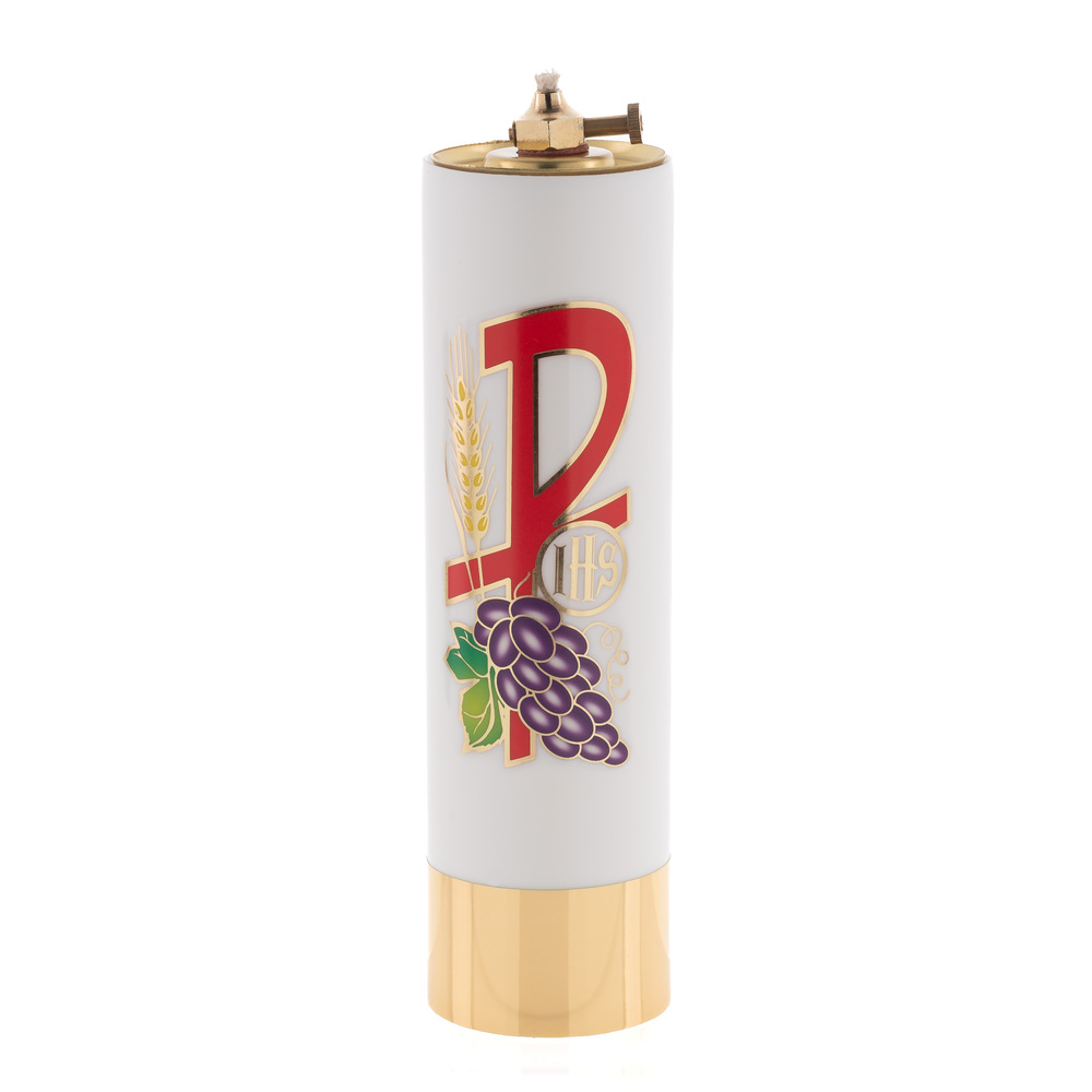 Świeca liturgiczna w kolorze białym z emblematem eucharystycznym z bardzo trwałego tworzywa doskonale imitującego prawdziwą parafinę.