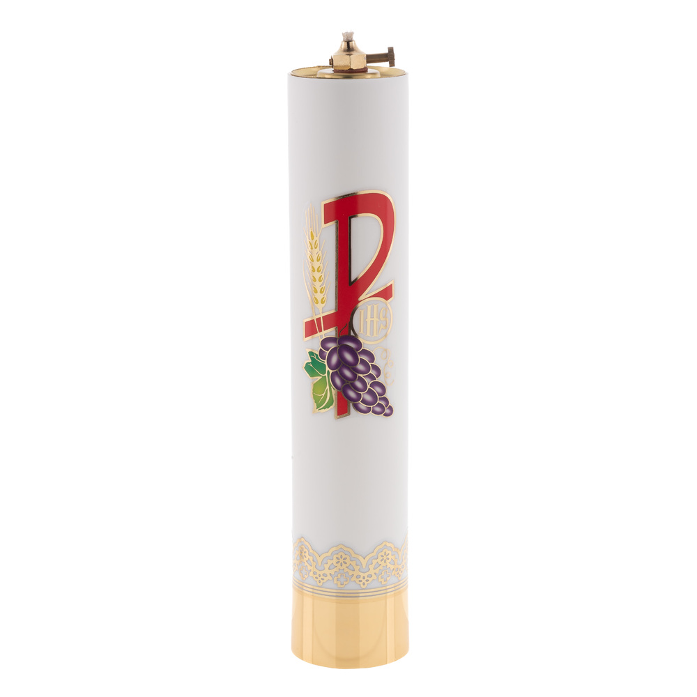 Świeca liturgiczna w kolorze białym z emblematem eucharystycznym z bardzo trwałego tworzywa doskonale imitującego prawdziwą parafinę.